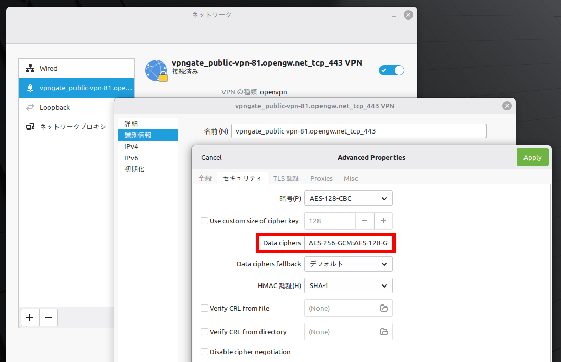 とは言うものの、VPN Gate公開サーバーは自分が管理するものでは無いため、暗号化プロトコルが古いとしても、サーバー側の要求「AES-128-CBC」に合わせるしかありません。